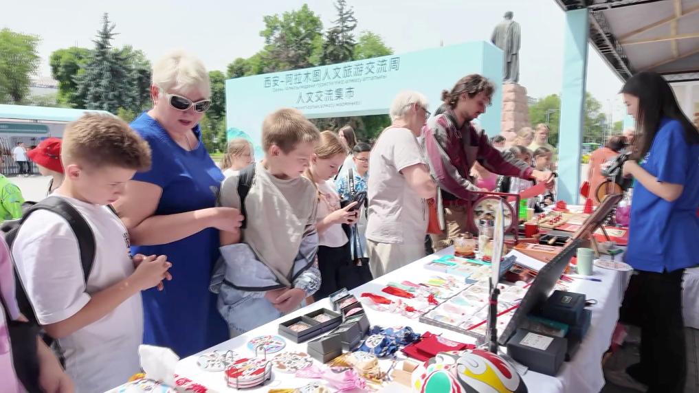 人文交流集市6月2日在阿拉木图市中心的广场拉开帷幕,非遗技艺、文创产品、中医药知识普及等丰富多彩的活动吸引了众多当地民众。