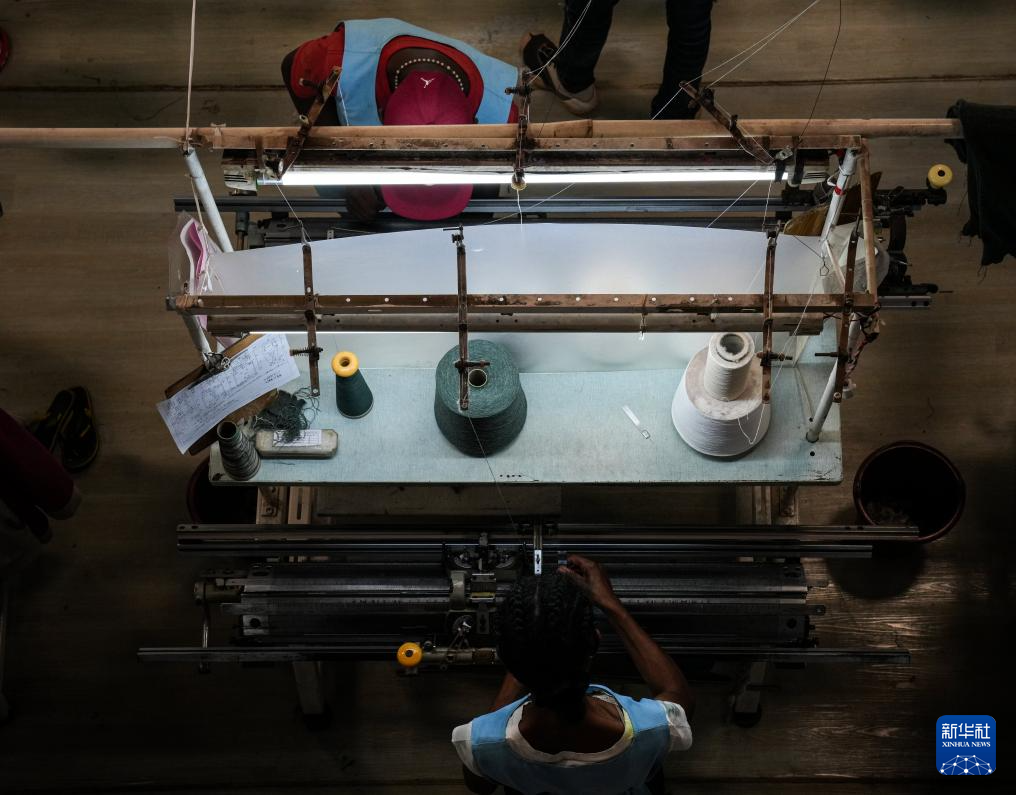 3月28日,在马达加斯加塔那那利佛,工人在内蒙古鹿王羊绒有限公司马达加斯加工厂横机手编车间内工作。新华社记者 李亚辉 摄