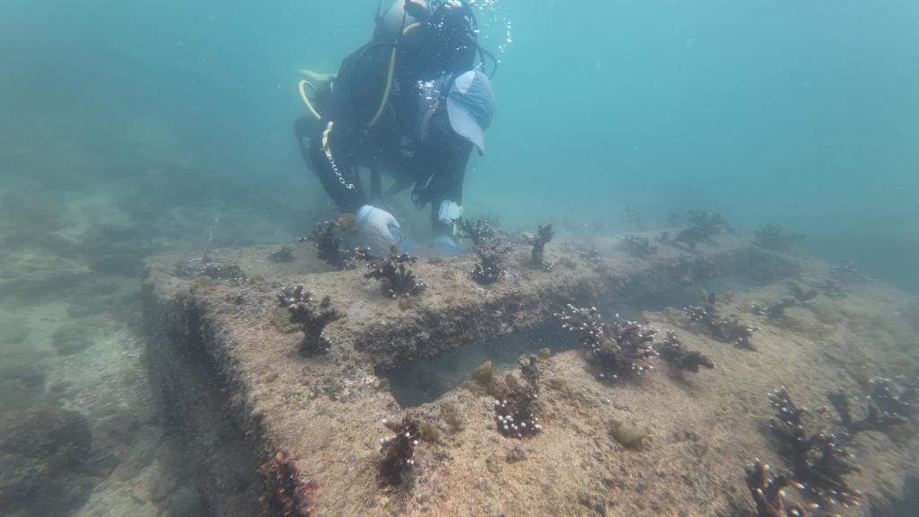 “种珊瑚”,是通过潜水作业将培育的珊瑚苗从苗圃移植到海底构筑的人工礁体上的作业方式。“这种修复技术就像‘扦插造林’。”团队成员、广西大学海洋学院副教授黄雯介绍,团队于2017年至2022年间在涠洲岛海域建成了面积约2000平方米的珊瑚礁生态修复示范区,示范区内活珊瑚覆盖率在3年内从约5%提升到了20%。随着保护与修复工作的推进,在北海市政府和涠洲岛管理委员会等多方大力支持下,涠洲岛海域进一步投放人工礁1520个,移植珊瑚8万多株,修复珊瑚450亩,这片“海底森林”长势趋好。