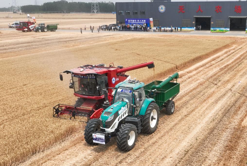 在山东滨州邹平市焦桥镇的中国科学院无人农场示范基地里,无人驾驶的2台收割机、2台运粮机和1台播种机联动协作,完成小麦收获和玉米播种作业。