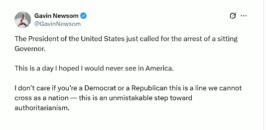 纽森9日上午在社交媒体发文说,特朗普竟然威胁要逮捕他,这种行为是美国“不能逾越的底线”。