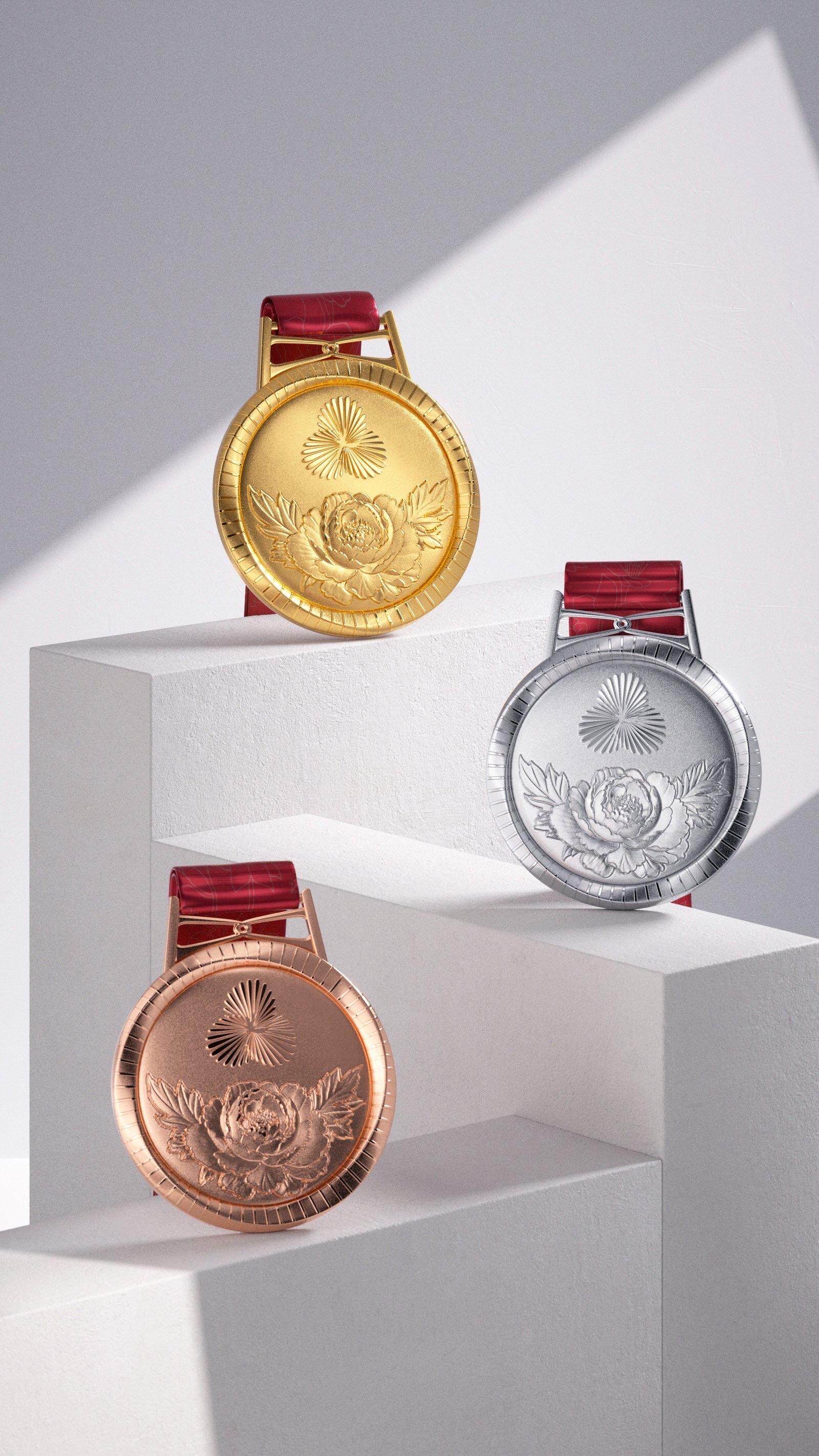在细节方面,奖牌挂扣采用了港珠澳大桥的同心结造型,寓意三地同心、紧密团结、共同发展。奖牌边缘特意设计了66道纹路,代表全国运动会已走过了66年历程。奖牌绶带以“三花映牡丹”为纹样,左右对称印有会徽、运动会举办地和时间。