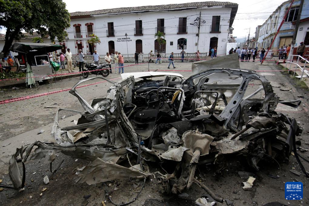6月10日,在哥伦比亚西南部考卡省科林托镇,一辆汽车在爆炸袭击中损毁。新华社发(哥伦比亚《时代报》供图)