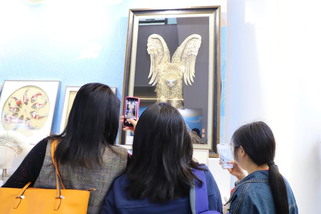 在作品竞赛区,赫哲族鱼皮技艺省级非遗代表性传承人解永亮此次带来了六件鱼皮制品参展,其中,《莫日根阔力》吸引了很多人的目光。“‘莫日根’是英雄的意思,‘阔力’是神鹰,这件作品取自赫哲族传说中的神鹰形象,我和团队用了九个月的时间制作,从绘制草图、挑选适合的鱼皮,到逐层拼贴、缝制,每一道工序都得靠手工。”解永亮说,近几年,越来越多的游客来到赫哲族聚集地,沉浸式体验赫哲族文化。