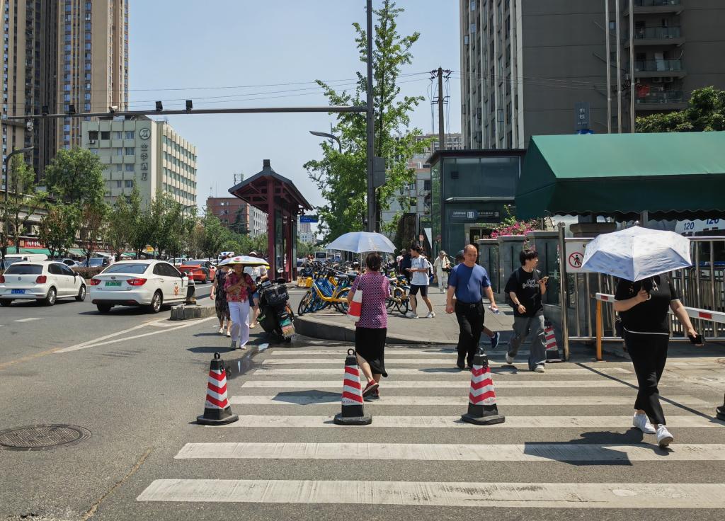 6月11日,成都出现高温天气,市民打伞出行。新华社记者 袁波 摄