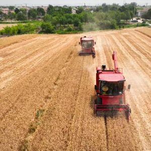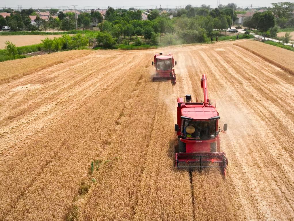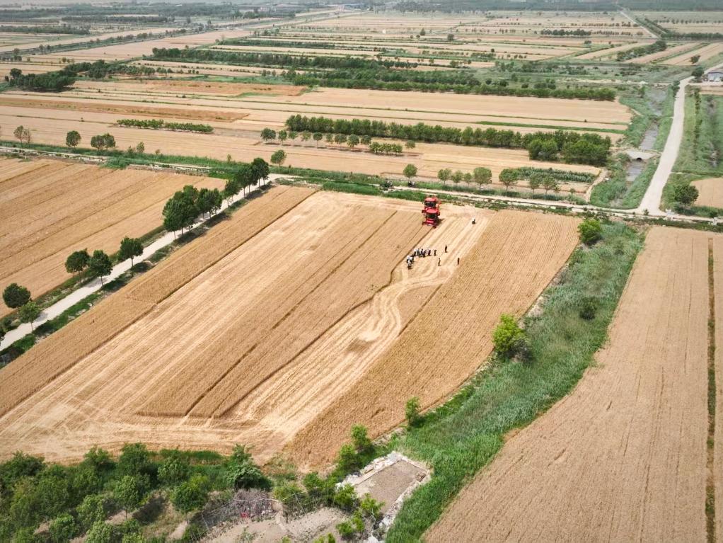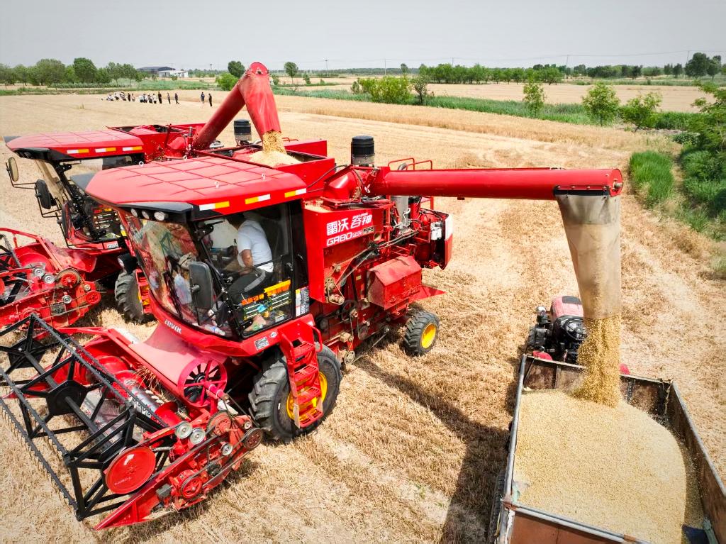 在山东省滨州市无棣县小泊头镇的麦田里,夏收正酣。金黄的麦浪随风起伏,联合收割机轰鸣着穿梭其间,齿轮飞转,饱满的麦粒倾泻入仓。