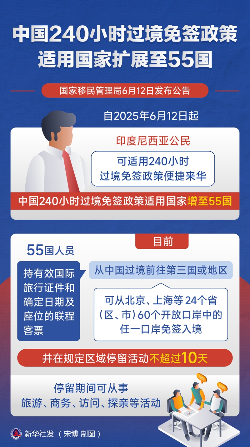 新华社北京6月12日电(记者任沁沁)国家移民管理局12日发布公告,自2025年6月12日起,印度尼西亚公民可适用240小时过境免签政策便捷来华,中国240小时过境免签政策适用国家增至55国。