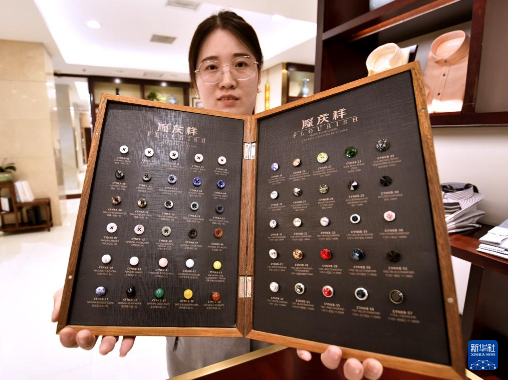 6月10日,隆庆祥总店的店员在展示定制纽扣。