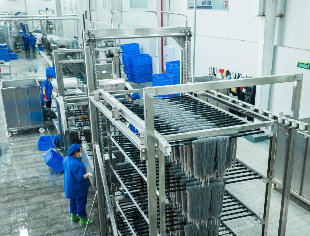 传统苕粉生产需将红薯洗净打碎成浆,再经热水烫煮、晾干等多个工序,耗时较长。而在重庆苗薯农业有限公司,自动化生产线上冷凝、烘干等环节一体化完成,苕粉生产效率大幅提升。