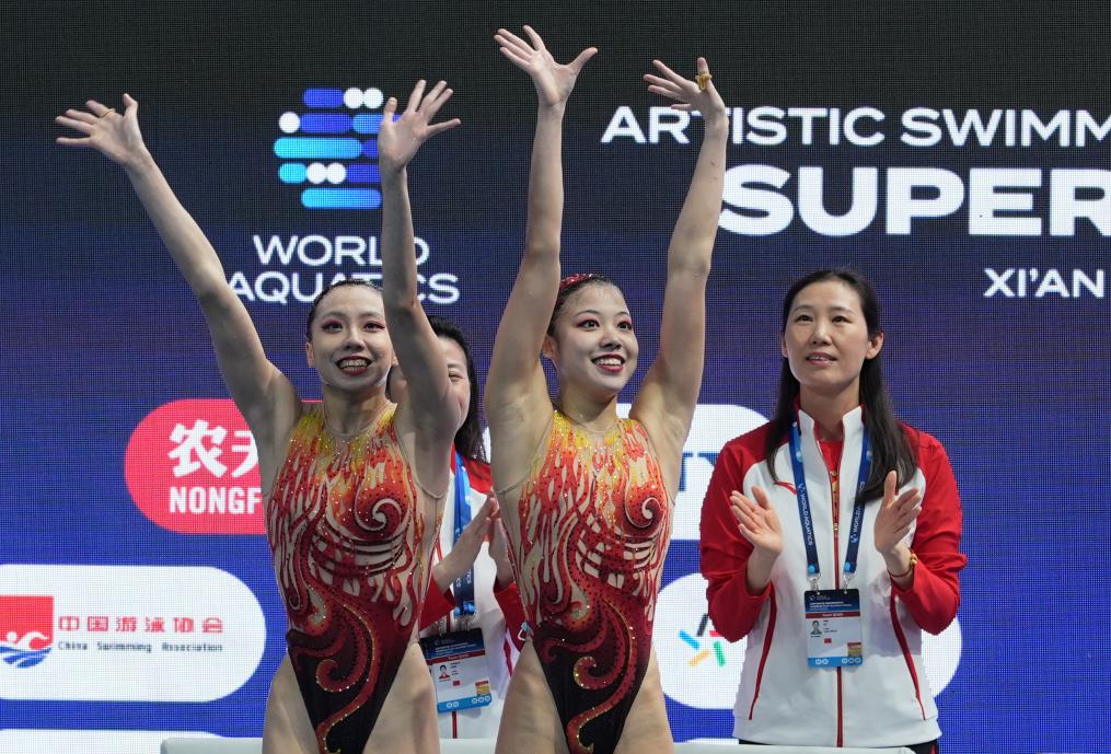 此前的世界杯加拿大站比赛中,中国队林彦含/林彦君在女子双人技术自选比赛中获得第三。来到总决赛,中国队在该项目中派出徐汇妍和林彦君搭档。中国花游队主教练张晓欢说,希望通过徐汇妍良好的技术带动和影响林彦君,提高双人项目的技术完成质量。最终,这对配对训练仅三周的组合没有辜负教练组的期望,她们以289.6150的总分站上最高领奖台,日本组合比嘉萌/佐藤友香、西班牙组合加塞特/瓦莱特分获第二、三名。