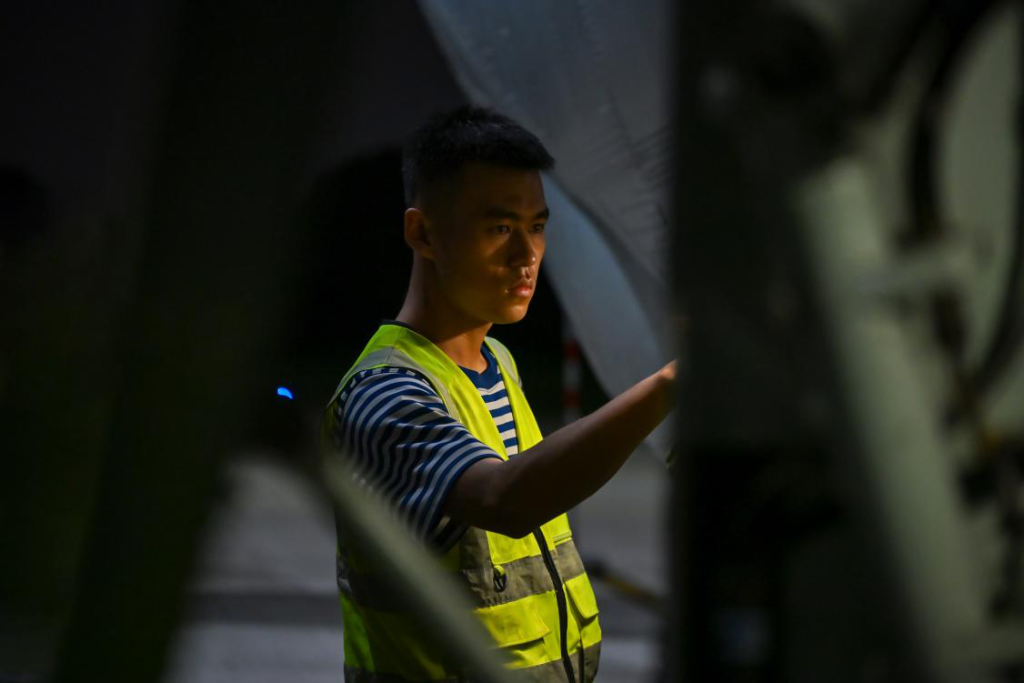 时间不知不觉流逝,一批批战机在海天之间接力反潜。暮色降临,海天界限渐渐变得模糊,飞行员紧盯仪表屏幕,操纵战机低空掠海飞行。深夜,随着最后一架战机平稳降落,训练圆满结束。