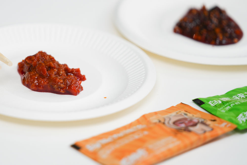 ↑6月6日,在湖南省长沙市一家便利店,顾客将卢旺达辣椒酱产品放入早餐米粉中。
