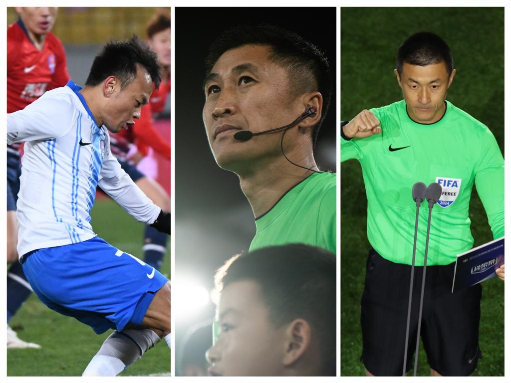 中国球员周通(左)、中国裁判员马宁(中)、傅明(右)