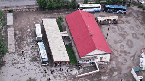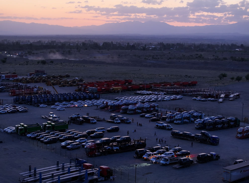 ↑傍晚时分,扎尔肯特镇的中转停车场依然在忙碌中(航拍照片)。