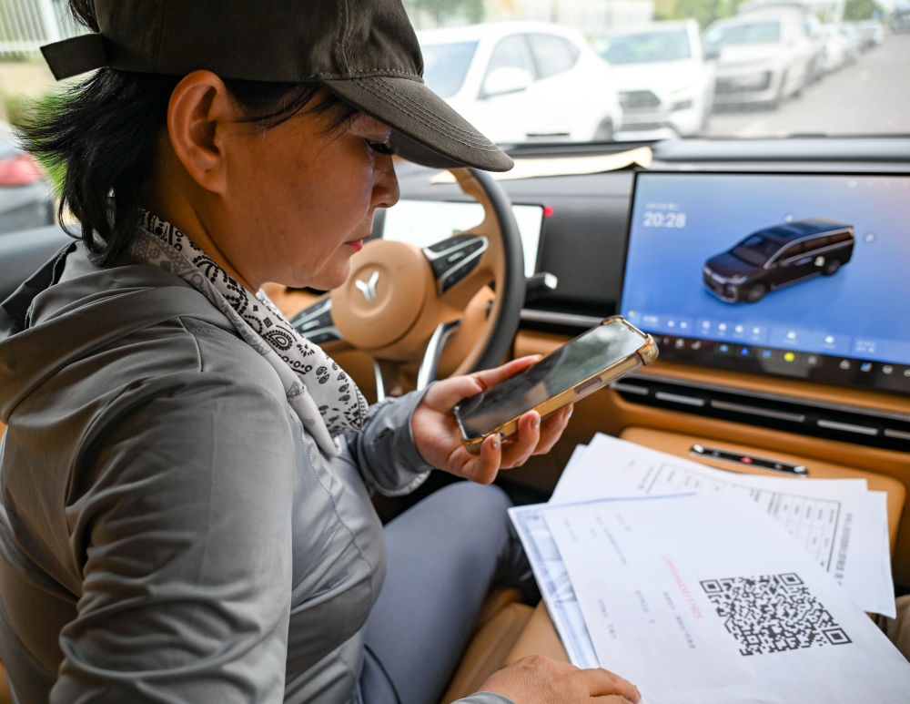 ↑在接到要运送的中国新能源汽车后,高云扫码录入出境所需的个人信息。