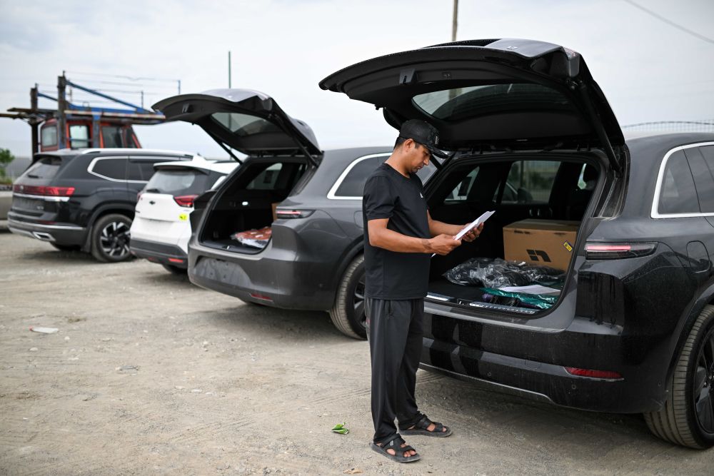 ↑在扎尔肯特镇的中转停车场,运输公司工作人员在查看从中国进口的新能源汽车的手续。