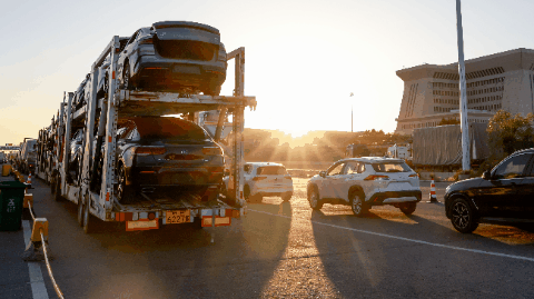 ↑在扎尔肯特镇的中转停车场,一辆满载从中国进口的新能源汽车的笼车准备启程。