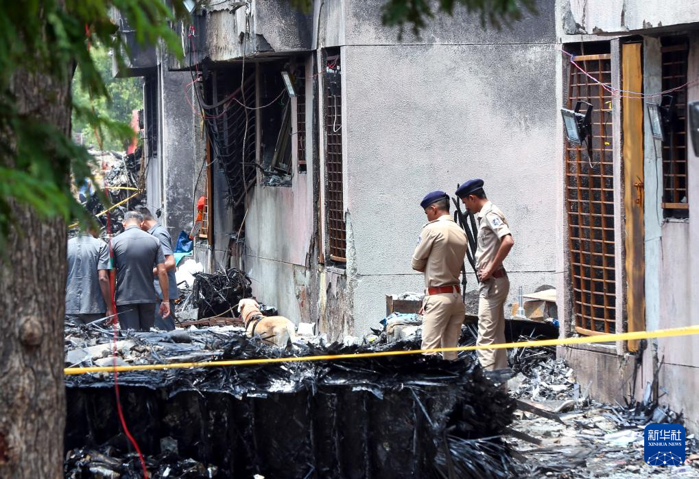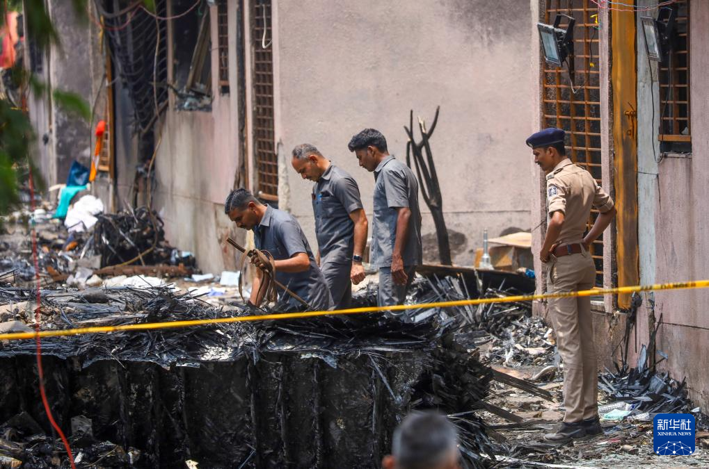 6月13日,工作人员在印度古吉拉特邦艾哈迈达巴德的坠机现场调查。新华社发(印亚新闻社供图)