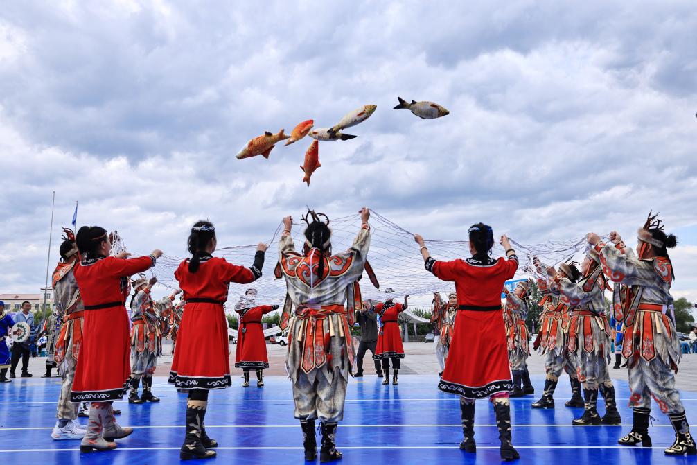 在赫哲族第十二届乌日贡大会现场,赫哲族群众进行民俗文艺表演。新华社发(刘万平摄)
