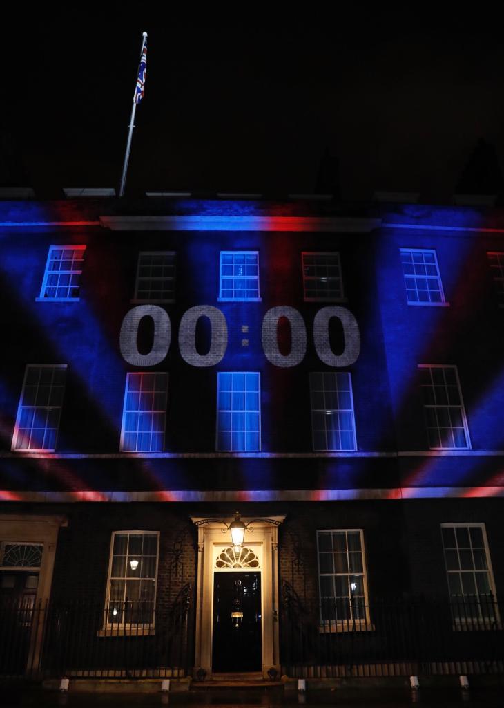 2020年1月31日,倒计时投影显示在首相府的墙面上。