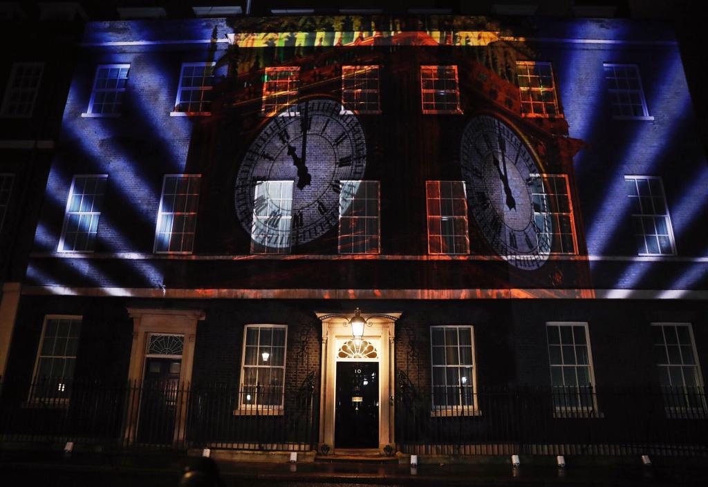 2020年1月31日晚11时,“大本钟”的投影显示在唐宁街10号首相府的墙面上,英国正式“脱欧”。