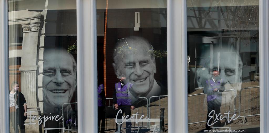2021年4月17日在英国温莎城堡外拍摄的一处摆放着已故菲利普亲王照片的橱窗。