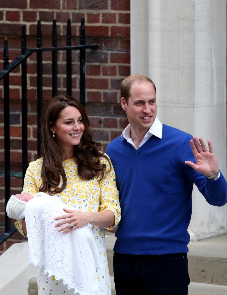 2015年5月2日,在英国伦敦,威廉王子(右)和怀抱小公主的凯特王妃在圣玛丽医院门前亮相。