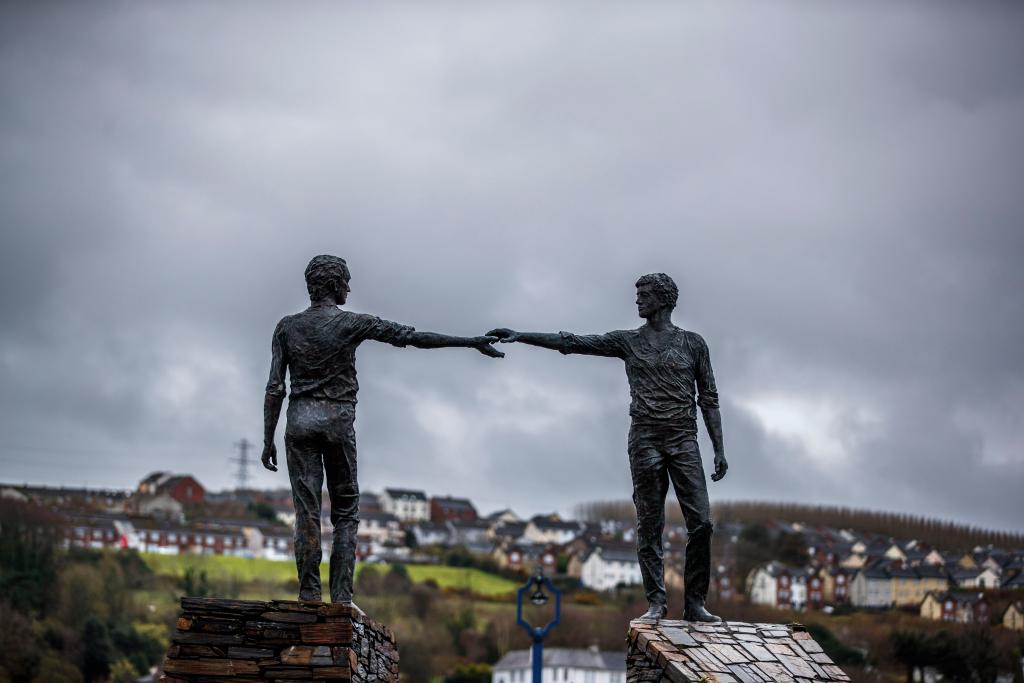 2019年3月18日在英国北爱尔兰第二大城市德里拍摄的以呼吁和平为主题的雕像。