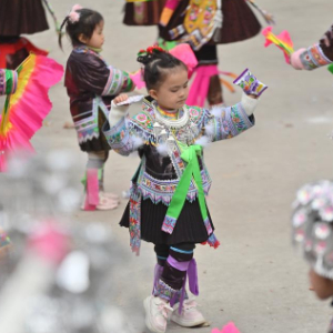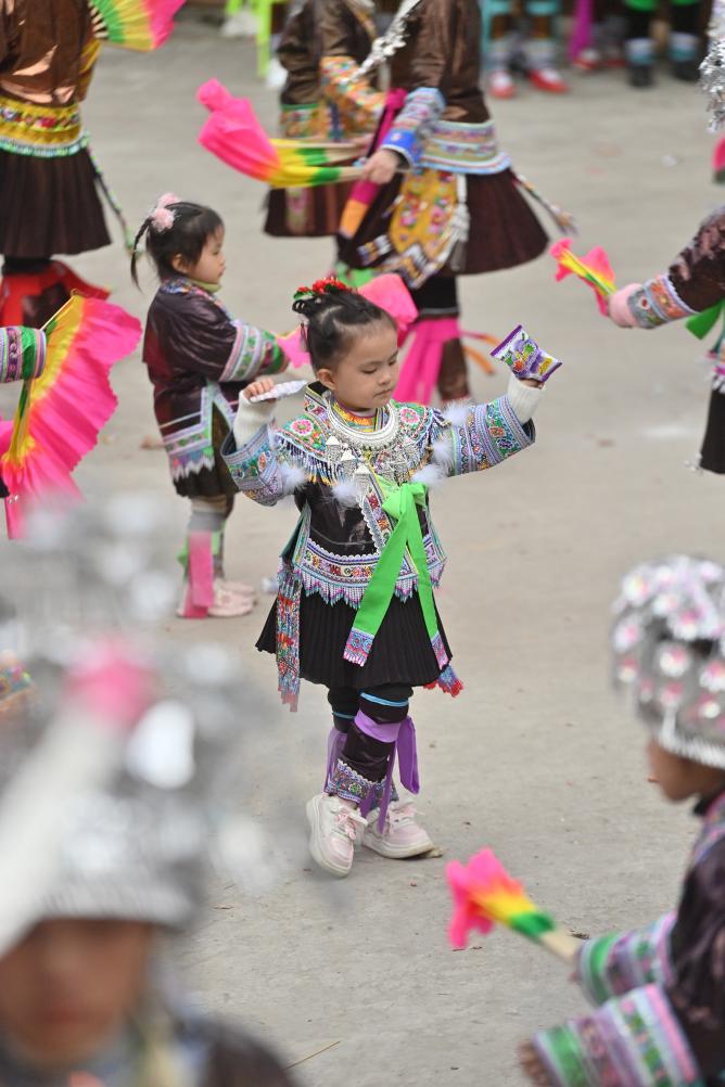 在广西柳州市融水苗族自治县杆洞乡乌英苗寨,6岁的吴采薇用零食当道具,和大人一起跳芦笙踩堂舞(2025年1月31日摄)。