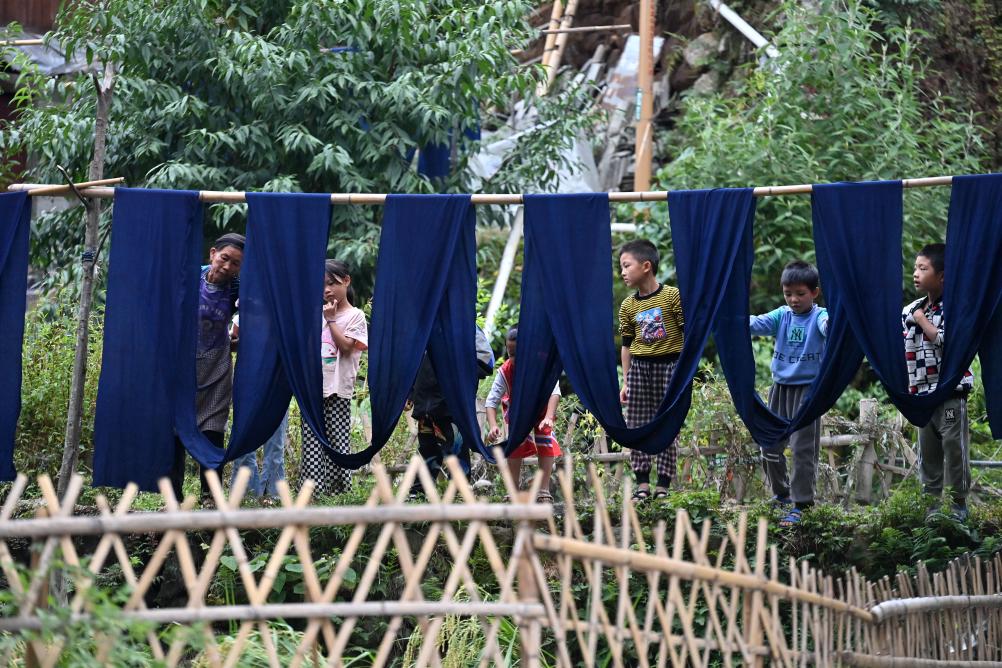 乌英苗寨的孩子们观看老人制作亮布(2022年9月7日摄)。