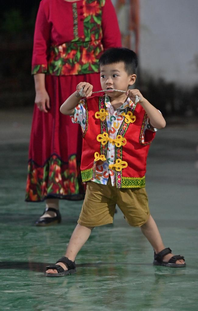 在大苗山深处的乌英苗寨:4岁的卜江辉,用双手当芦笙,跟着爸爸的节奏吹起来;6岁的吴采薇用零食当道具,跟着妈妈的步伐舞动。
