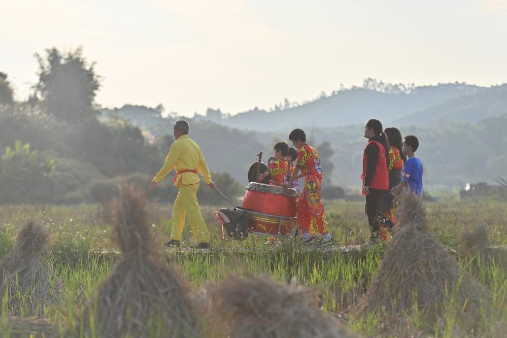 在广西梧州市藤县金鸡镇同荣村,龙狮队的小学生前往村屯进行表演(2023年12月6日摄)。