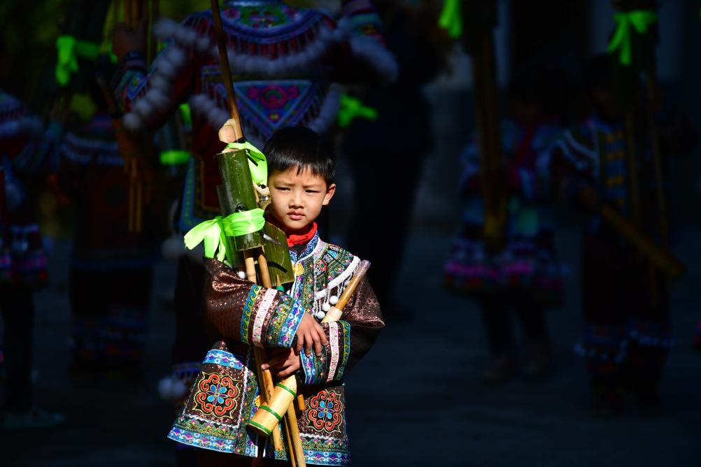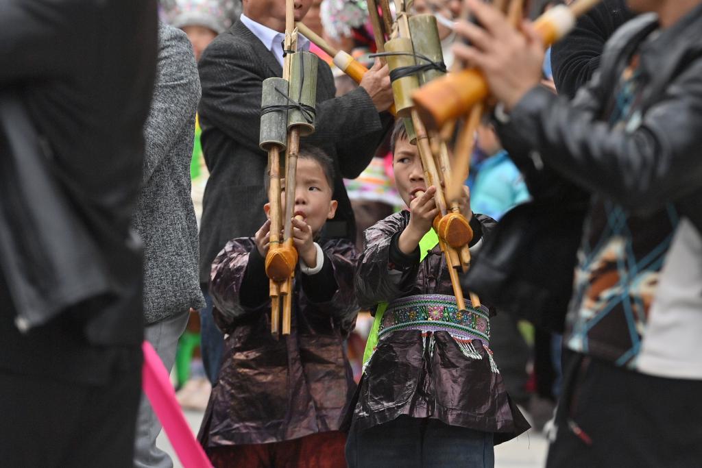 乌英苗寨的小朋友在新春打同年活动中吹芦笙(2024年2月14日摄)。