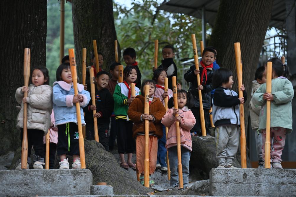 乌英苗寨教学点的孩子们在“亮布文化进校园”课堂上,练习使用亮布槌(2022年11月14日摄)。