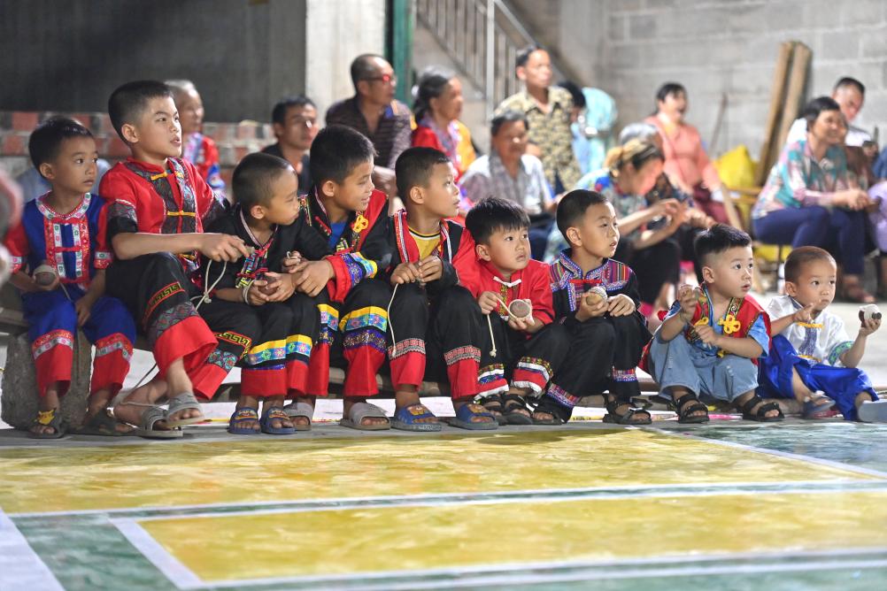 在广西河池市大化瑶族自治县大化镇仁良村,小朋友们在等待参加陀螺比赛(2023年6月4日摄)。