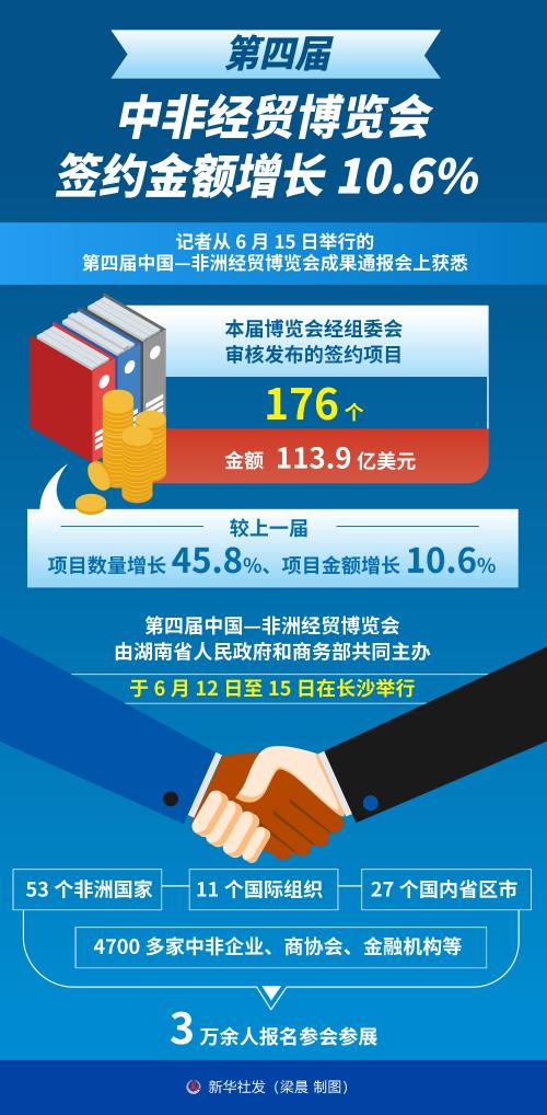 新华社长沙6月15日电(记者张玉洁、王腾)记者从15日举行的第四届中国—非洲经贸博览会成果通报会上获悉,本届博览会经组委会审核发布的签约项目176个、金额113.9亿美元,较上一届,项目数量增长45.8%、项目金额增长10.6%。