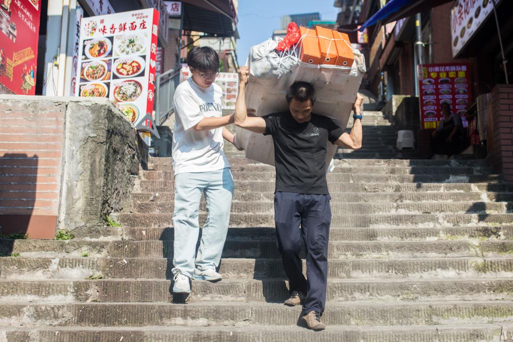 ↑2025年6月14日,冉光辉(右)在搬运货物,冉俊超在一旁小心搀扶。