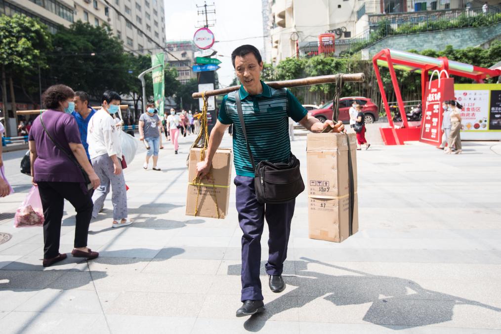 ↑2020年6月10日,冉光辉挑着扁担运送货物。