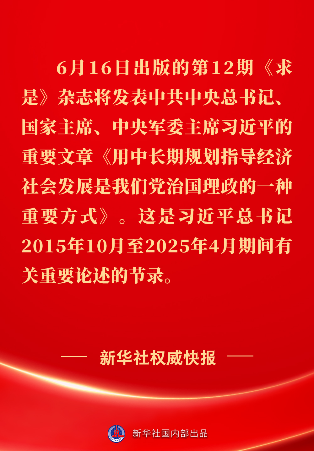 6月16日出版的第12期《求是》杂志将发表中共中央总书记、国家主席、中央军委主席习近平的重要文章《用中长期规划指导经济社会发展是我们党治国理政的一种重要方式》。这是习近平总书记2015年10月至2025年4月期间有关重要论述的节录。