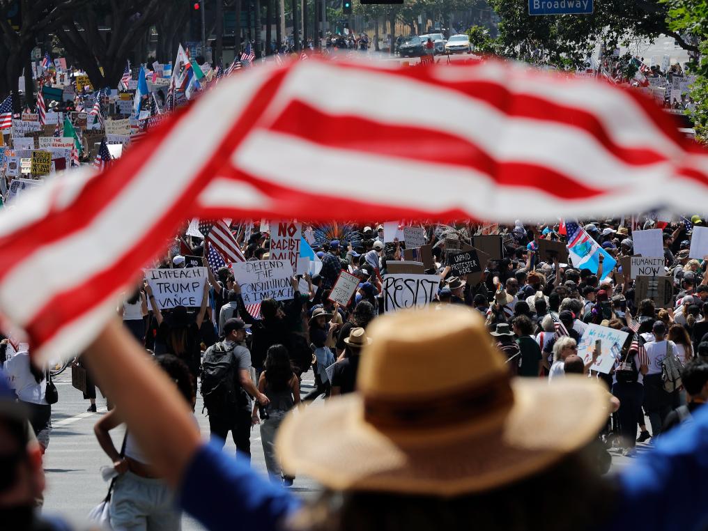 6月14日,美国加利福尼亚州洛杉矶市中心,人们参加“不要国王”抗议活动。新华社发 (邱晨摄)