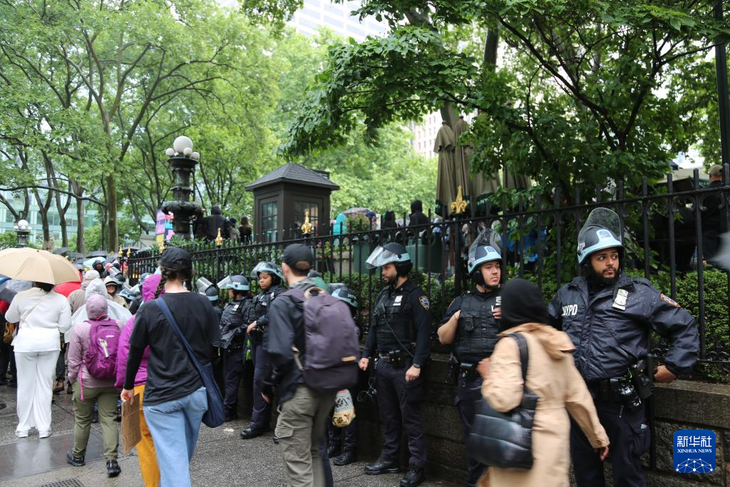 6月14日,美国纽约市曼哈顿中城布赖恩特公园,警察在抗议现场执勤。 新华社记者 刘亚南 摄