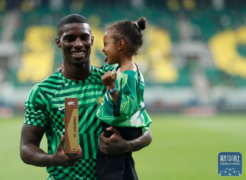 ↑2023年9月15日,北京国安队球员法比奥接受女儿为他颁发的中超联赛八月最佳球员奖。新华社记者 贾浩成
