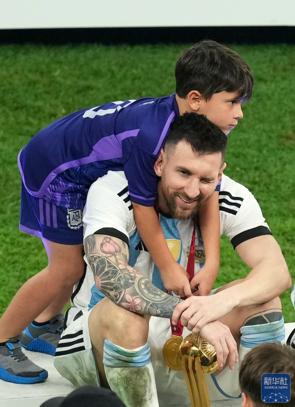 2022年12月18日,阿根廷队球员梅西(下)在卡塔尔世界杯夺冠后与孩子庆祝。新华社记者 潘昱龙 摄