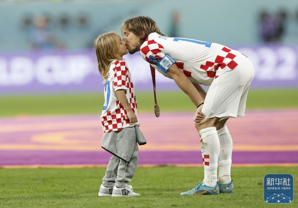 ↑2022年12月17日,克罗地亚队球员莫德里奇(右)与孩子在卡塔尔世界杯足球赛三、四名决赛后庆祝。新华社记者 王丽莉