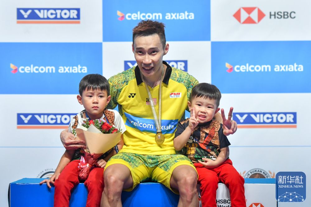 ↑2018年7月1日,生涯第12次获得马来西亚羽毛球公开赛男单冠军的李宗伟(中)与儿子在颁奖仪式上合影。(张纹综摄