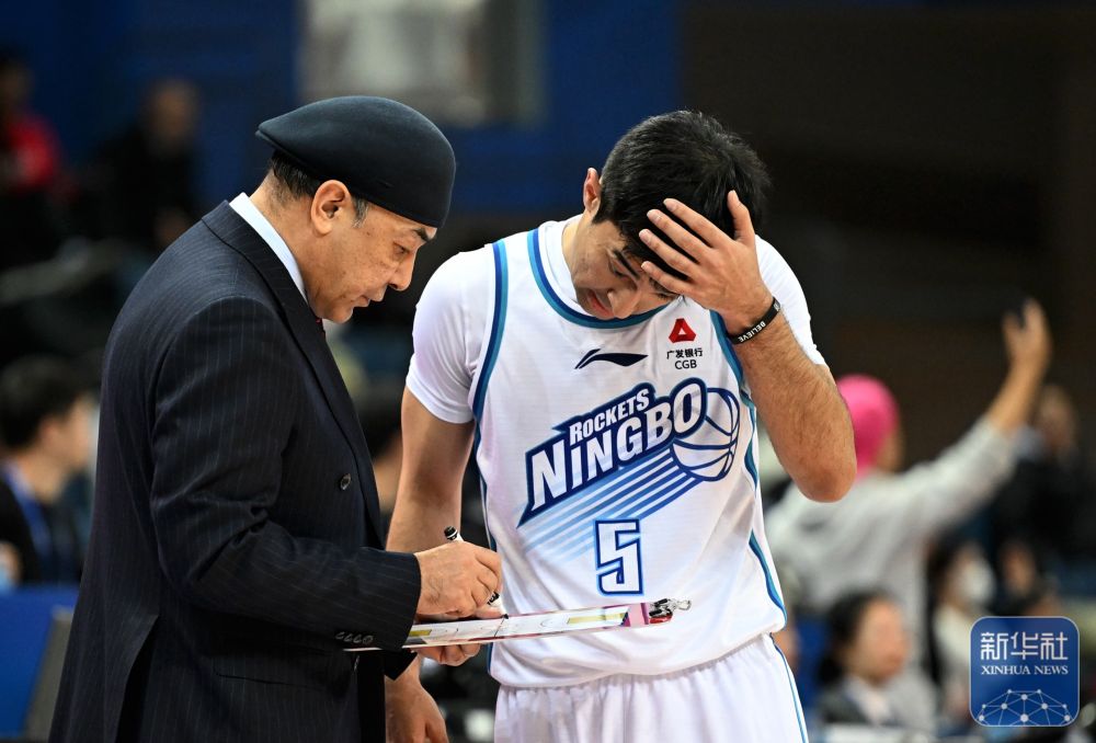 ↑2023年12月27日,CBA常规赛,宁波町渥队主教练阿的江(左)在场边指导球员阿尔斯兰新华社记者 孙凡越