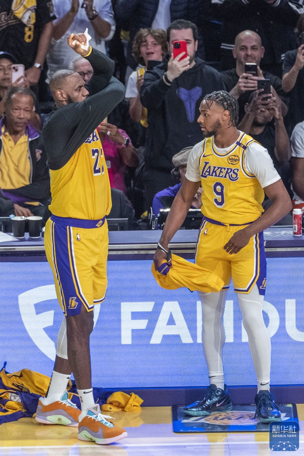 ↑2024年10月22日,NBA常规赛,湖人队球员勒布朗·詹姆斯(左)与儿子布朗尼·詹姆斯准备上场比赛。新华社发(赵汉荣摄)