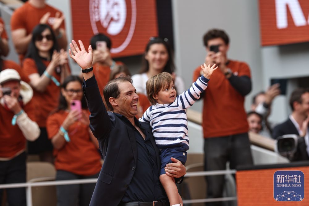 ↑2025年5月25日,纳达尔和儿子在2025年法国网球公开赛为纳达尔举行的致敬仪式上。新华社记者 李京摄