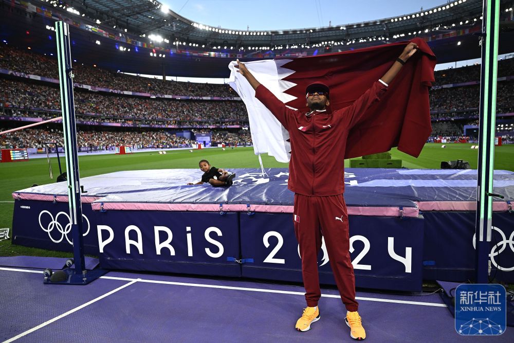 ↑2024年8月10日,巴黎奥运会田径男子跳高季军卡塔尔选手巴希姆与他的孩子在比赛后庆祝。新华社记者宋彦桦 摄