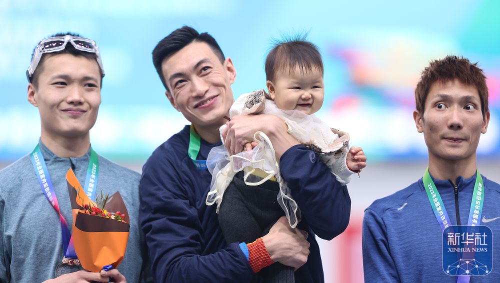 ↑2023年3月17日,全国室内田径锦标赛男子三级跳远冠军辽宁队选手朱亚明(左二)抱着女儿在颁奖仪式上。新华社记者 李明